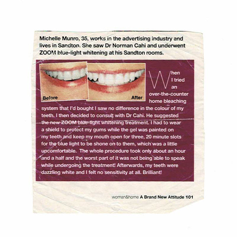 In a quest for a brighter smile, Michele Munro visited Dr. Norman Cahi's Sandton rooms and experienced the transformative ZOOM blue-light whitening treatment. Witness firsthand as Michele undergoes this innovative procedure, bringing radiance and confidence to her smile.